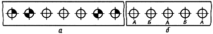 1.3. Если на чертеже необходимо показать несколько групп заклепок различных типов и размеров, то рекомендуется отмечать одинаковые заклепки одним и тем же условным знаком (черт.2а) или одинаковыми буквами (черт.2б).