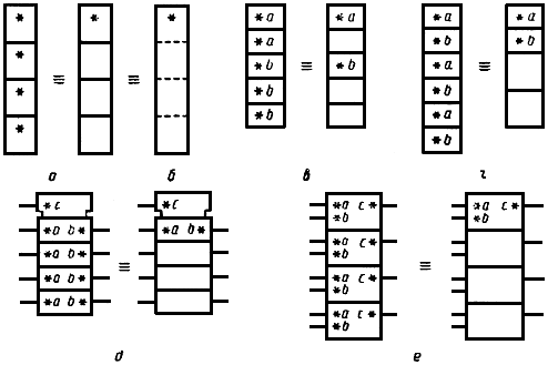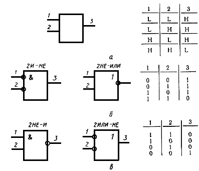8. Логические элементы могут иметь логические эквивалентные формы. Например, элемент, имеющий таблицу истинности, выраженную в уровнях сигнала, которая приведена на черт.22а, имеет эквивалентные формы в положительной логике и в отрицательной логике, представленные на черт.22б и черт.22в соответственно.